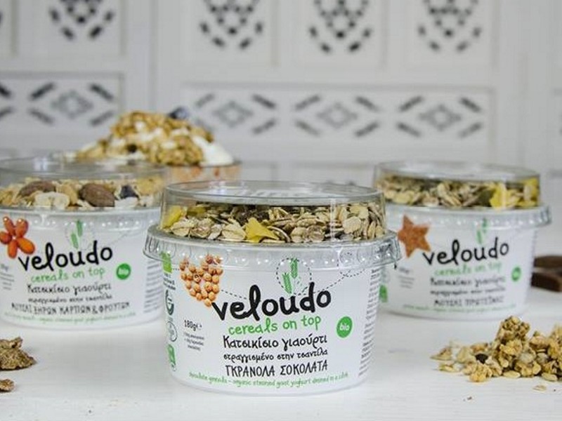 Organic goat strained yoghurt new series Veloudo with cereals by Bioagros in Kotronis Plastics packaging! You may taste it with granola chocolate, protein muesli or nut and fruit muesli!